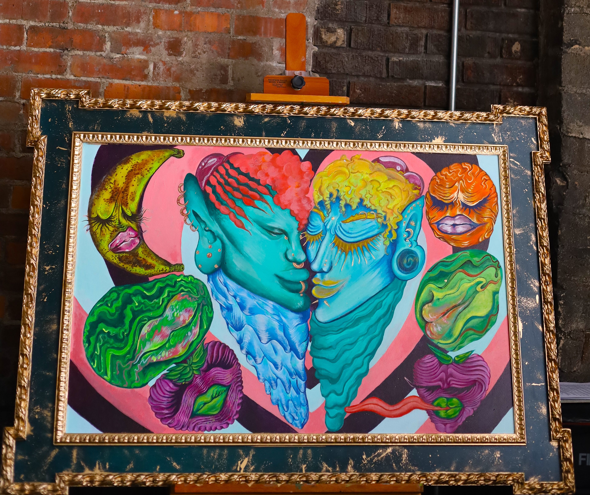 GOAL: "Sweet life" was painted over a colonial work and speaks to the right every "fruit" has to a joyful, carefree existence. I intended to create a juicy world where queer love radiates freely, shines and is centralized.